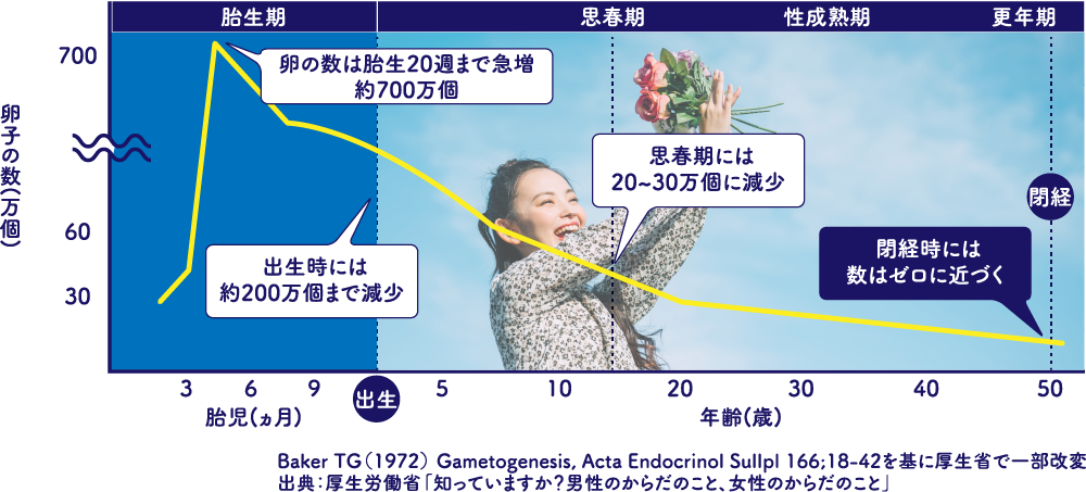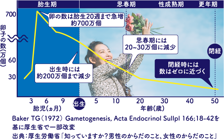卵子は月経によって毎月1個ずつ減っていく、と大きな誤解をしている人も少なくありません。卵子の数は女性が生まれた時には200万個、初潮の頃には20万個、35歳で数万個、