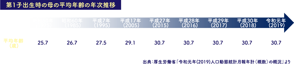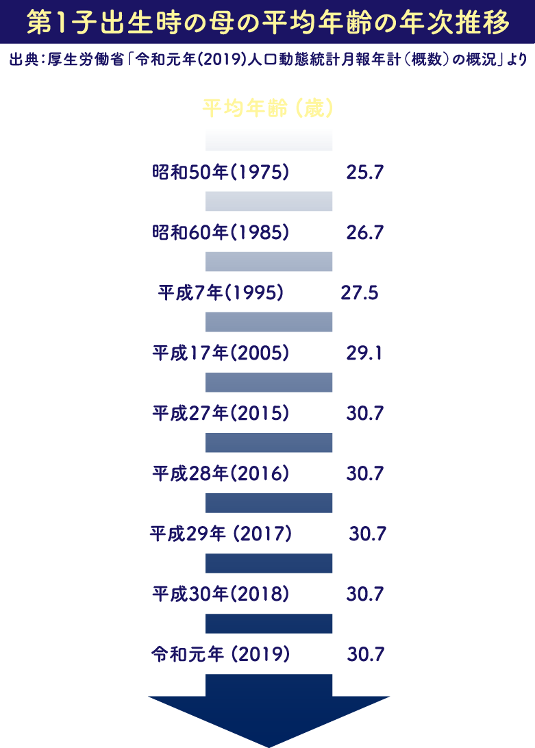 日本では晩婚化や女性のキャリア志向で結婚する年齢が上昇しているなどの背景もあり、不妊治療に大きな注目が集まっています。2019年には女性が第1子を出産する平均年齢は30.7歳となっています。35歳以上の出産は高年齢出産となりますが、このように日本では多くの女性が高年齢出産をしているという事実が分かります。