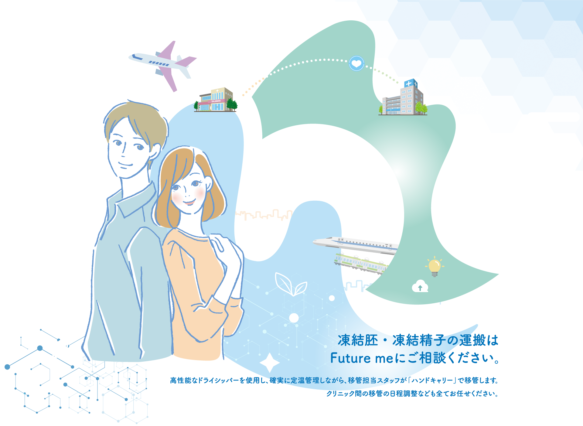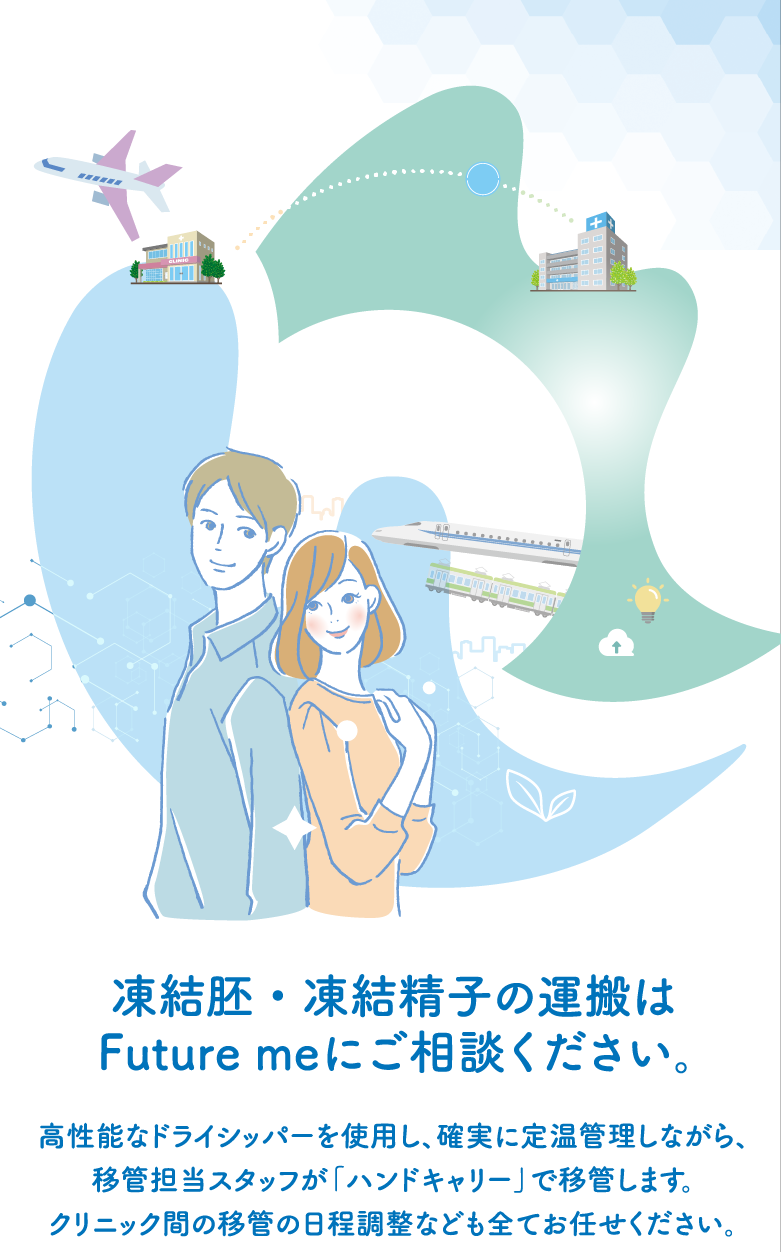 Future meはお客様の凍結胚や凍結精子を、他の方の荷物と混載することなく、個別にハンドキャリーで移管します。主に公共交通機関を利用して移管するので、移管途中の事故のリスクもありません。Future meのスタッフは自分の荷物のように大切に、細心の注意を払い移管します。それが安心の証です。