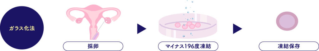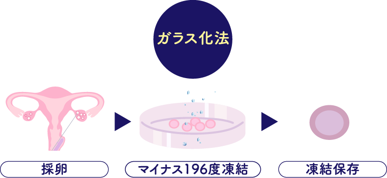 その解決策として、高齢不妊(35歳以上)に備えるために「卵子凍結」という方法があります。卵子が若い内にクリニックで採卵し、それをマイナス196度で凍結保存するという方法です。この方法をガラス化法と呼びます。凍結された卵子は凍結期間による劣化はなく半永久的に保存が可能です。気持ちの準備もできて、パートナーとも相談して妊娠したいと思う時まで、卵子の凍結保存が可能です。